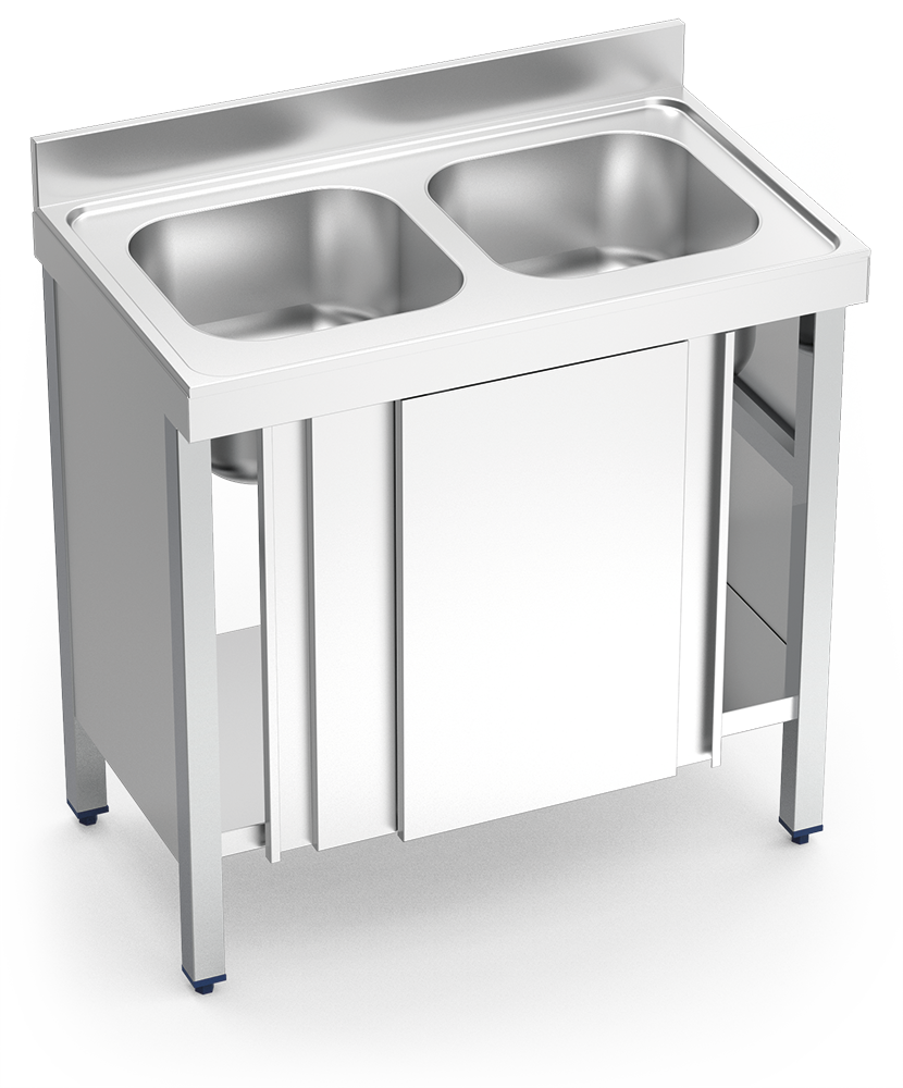 Sink unit in stainless steel with sliding doors, 2 tanks 1000x600x850 mm