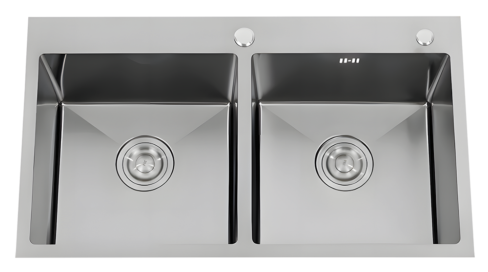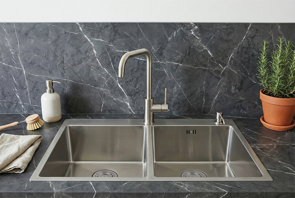 Fregadero de doble cubeta con una presencia más estructurada y equilibrada. Aporta versatilidad operativa manteniendo una estética menos industrial y más alineada con proyectos de interiorismo contemporáneo.